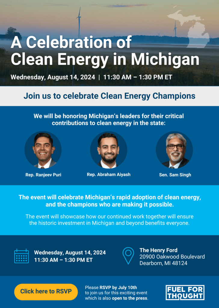 Fuel for Thought is hosting an event here in Dearborn on August 14 celebrating Michigan’s adoption of clean energy. The event will honor local leaders, including Rep. Ranjeev Puri, Rep. Abraham Aiyash, and Sen. Sam Singh.