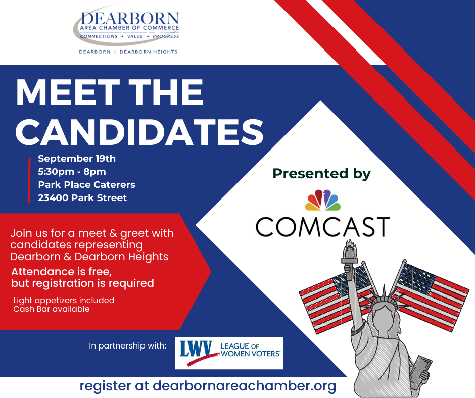The Dearborn Chamber of Commerce, in partnership with the League of Women Voters is hosting a meet the candidates event for local races at 5:30 PM on September 19th at Park Place (23400 Park Street).