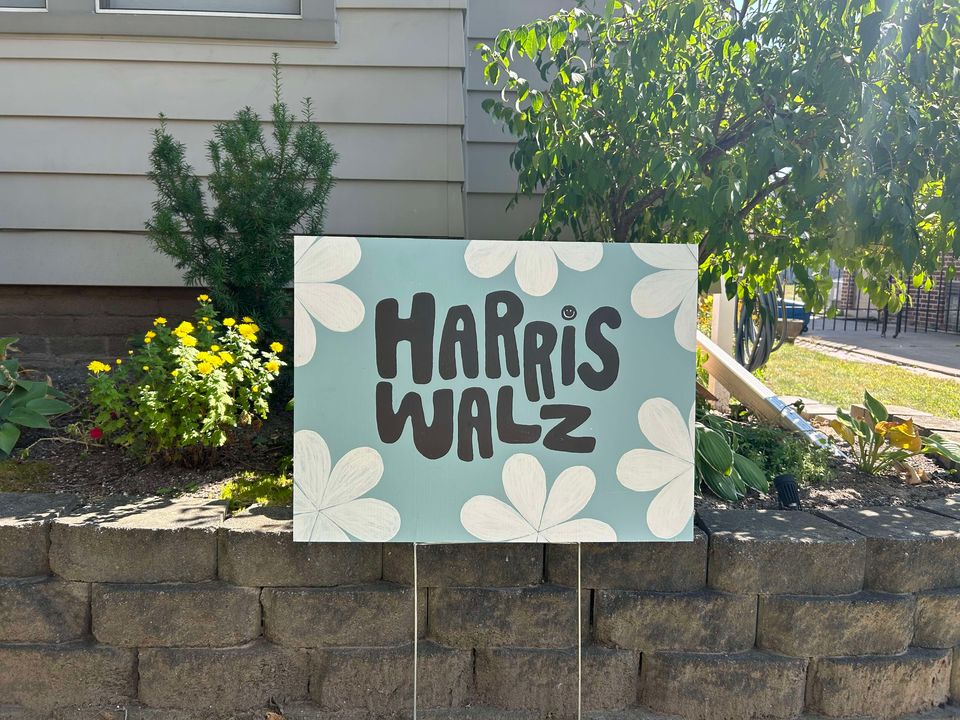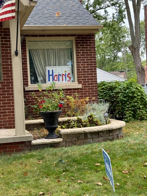 While we wait for new Harris-Walz signs, we thought it would be fun to challenge our members and supporters in the area to make their own signs for display in their yards or windows. Many of us have old signs in our garages and basements that can be reused and customized. Below is a photo from one of our club members who came up with the idea.